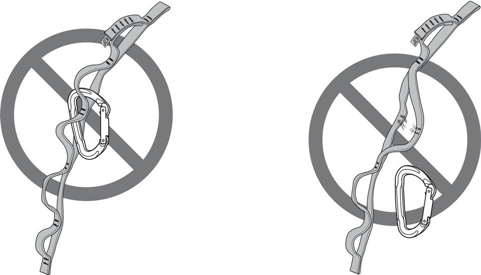 NEVER clip a carabiner in to more than one pocket at a time. If the bar-tacks between the pockets were to fail under load, you would no longer be clipped in! This scenario could occur when any two pockets are connected to a single carabiner