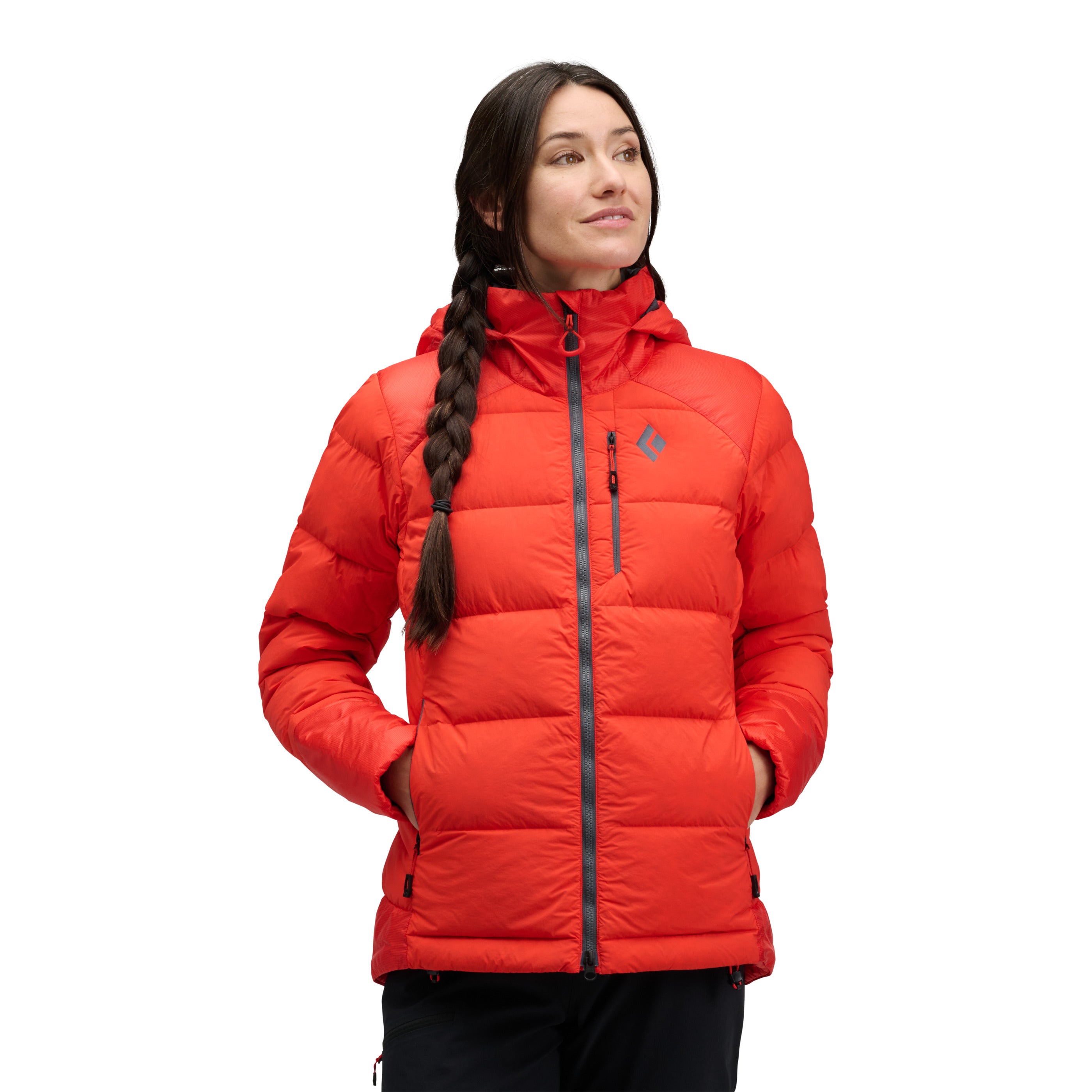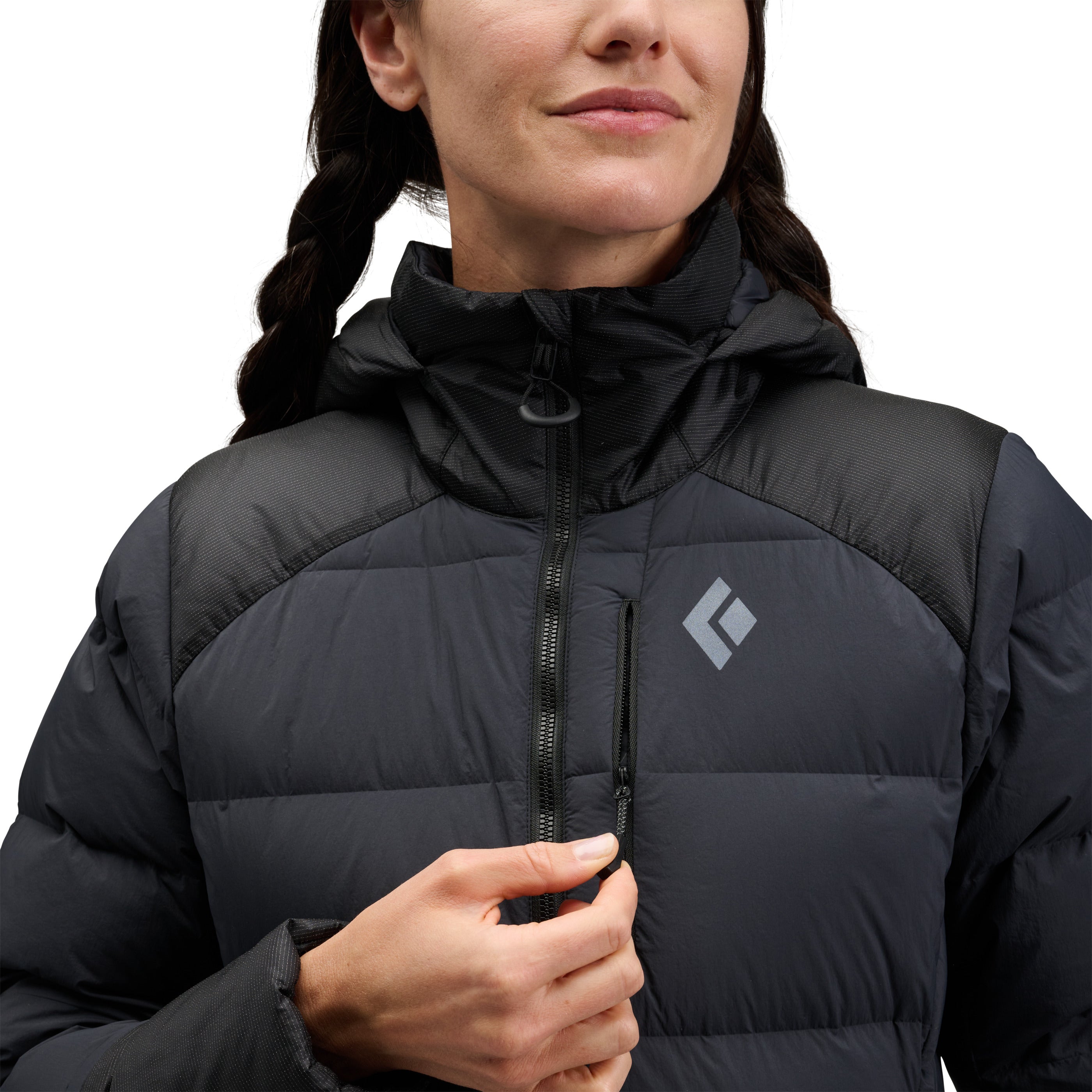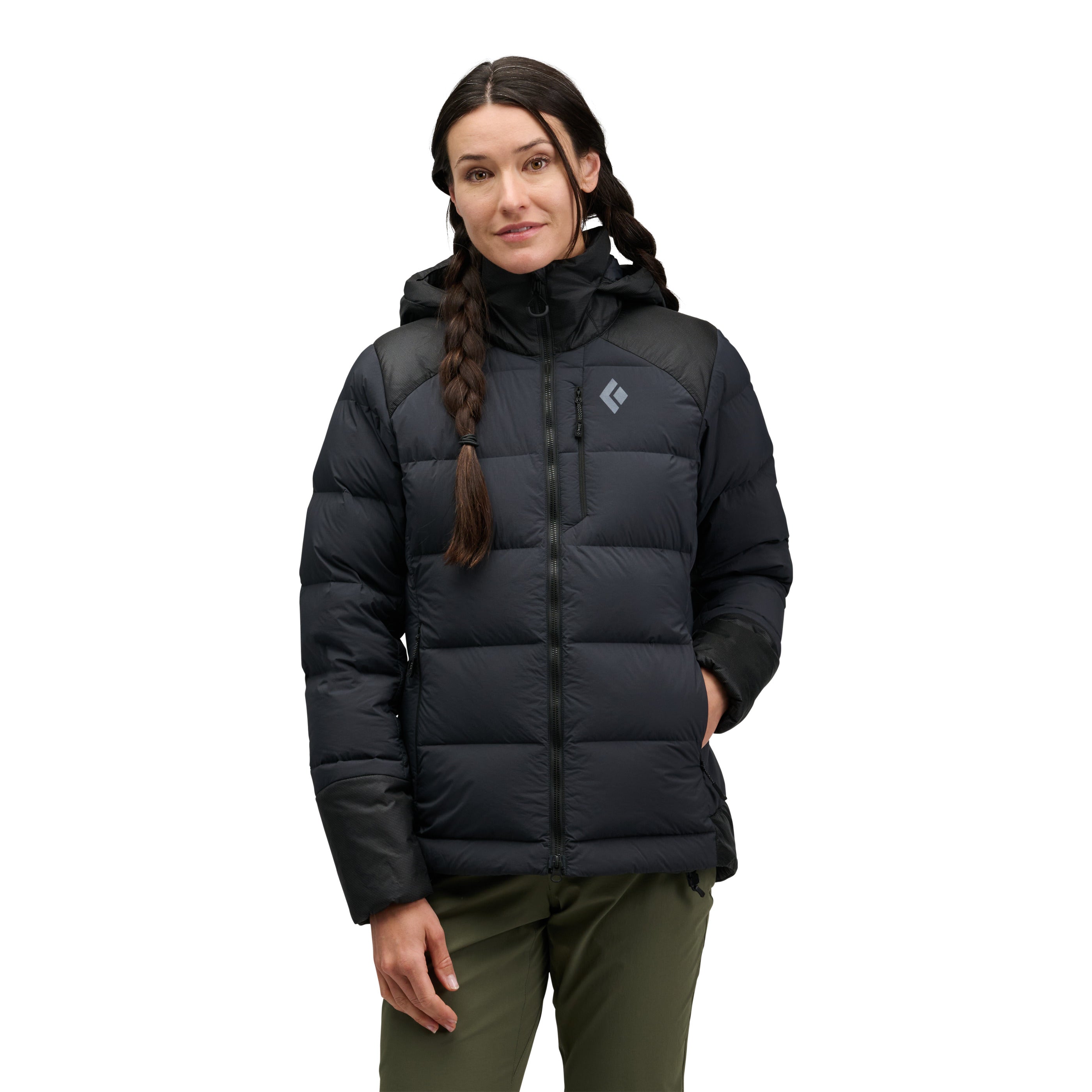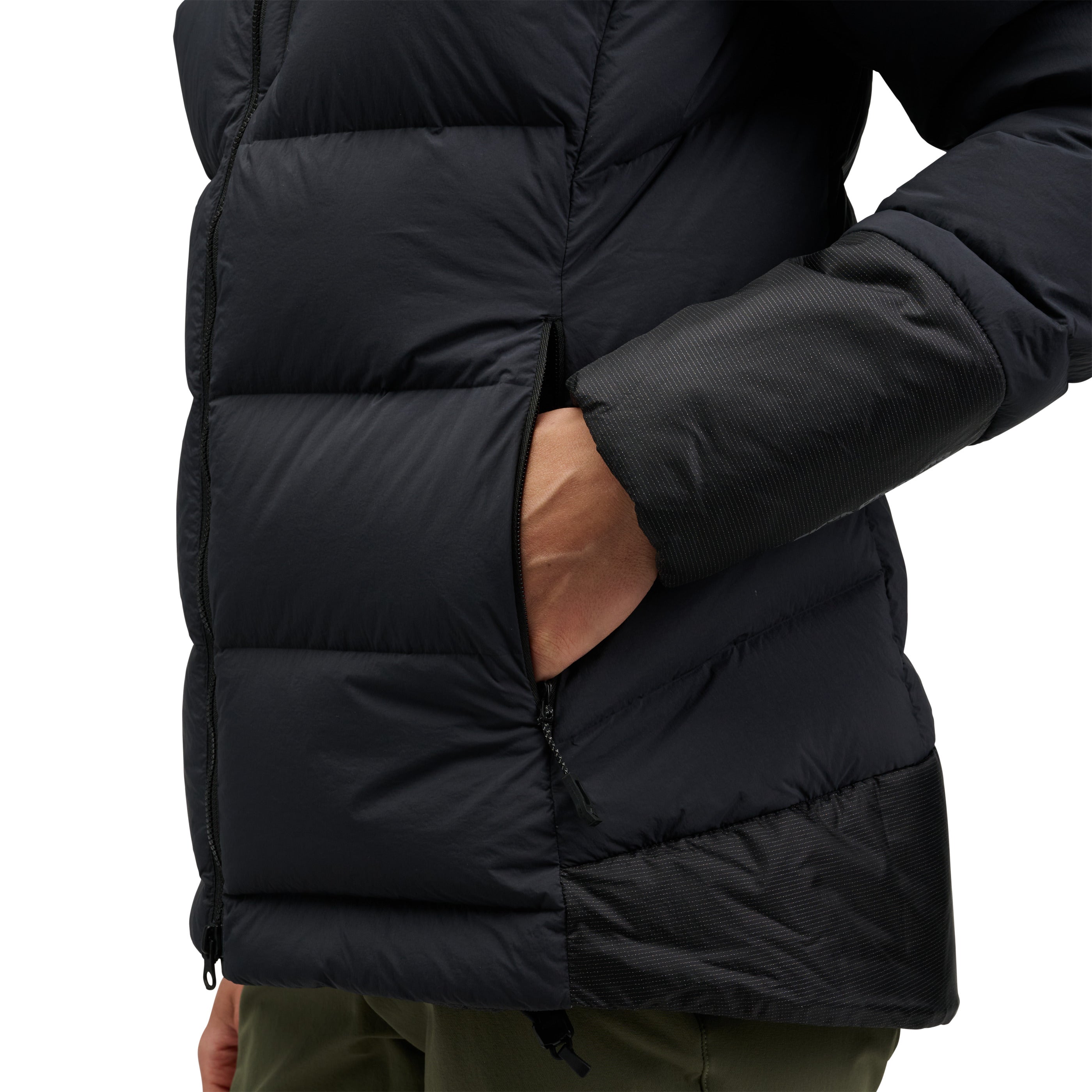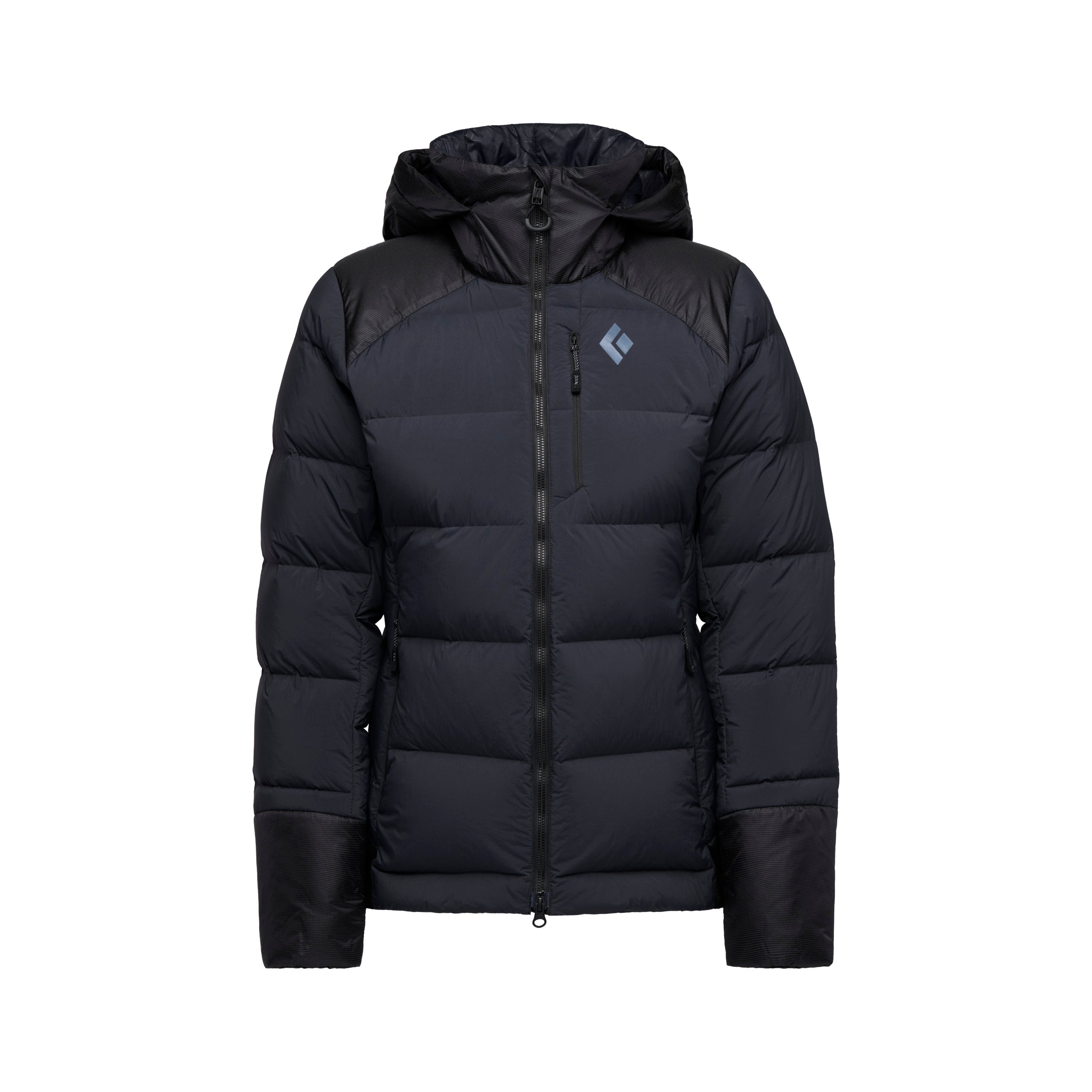 Technical insulation built for the mountains; the Black Diamond Mission 3000M Parka blends 800-fill down with synthetic insulation for added durability in high-wear areas.